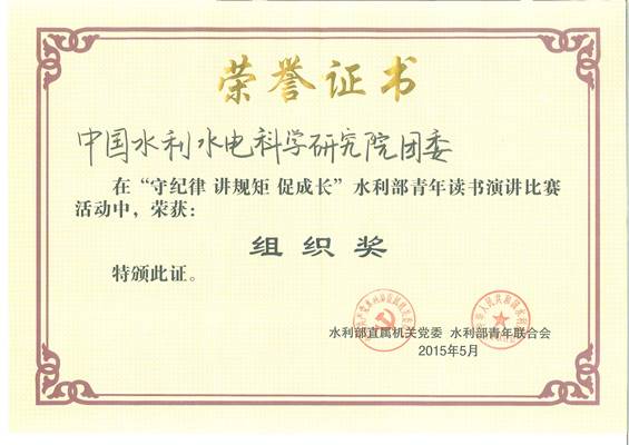 5月4日上午,水利部直属机关党委举办“守纪律、讲规矩、促成长”青年读书演讲比赛,部党组书记、部长陈雷出席并做重要讲话。我院党委书记曾大林,院党委常委、副院长汪小刚参加活动,院团委荣获比赛组织奖,青年职工周虹、田继雪荣获二等奖,周虹荣获“人气奖”,杨轶龙荣获“好书推荐奖”。