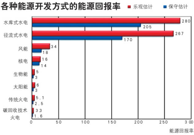 人们所以青睐水电,不仅由于它是用之不尽的能源,而且是经济上最划算的能源,其能源回报率也最高。能源回报率是指一个发电站在运行期内发出的电力与它在建设期、运行期为维持其建设、运行所消耗的所有电力的比值。如以一个火力发电厂为例,建设期和运行期所消耗的所有电力既包括直接能源消耗,如机械设备运行、照明耗能等,也包括建筑材料、煤炭消耗、制造、运输等过程的耗能。按照这一定义可估算出各种能源开发方式的能源回报率:水电在170以上,远高于风电的18~34,生物能的3~5,太阳能的3~6,核电的14~16和传统火力发电的2.5~5.1。发达国家凭借资金、技术和市场机制等多方面的优势,比发展中国家早30多年优先完成了本国水电的开发任务。