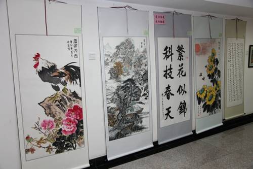 书画作品展示了老同志们富于想象力和创造力的才艺:有老同志为庆祝建党90周年题写的书法作品《繁花似锦 科技春天》,有象征祖国未来蒸蒸日上的国画作品《向太阳》,还有摹写毛主席《长征》、《纪念白求恩》的书法作品,更有心思细腻的剪纸贴画和烙烫人物画作品。