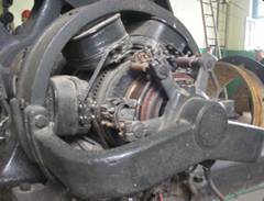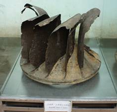 随后,我们来到了电站第一厂房,在厂房前,耸立着“中国第一座水电站”的纪念碑。进入第一厂房,刘主任指着在厂房另一端那台黑乎乎的机组说,那就是中国最早的水电机组。由于正值机组检修,我们有幸仔细观赏了它的内部构造和每一个零部件。刘主任告诉我们,石龙坝近百年的水电机组曾遭受过严重的污染腐蚀,电厂上游一些化工企业排放酸质污水,造成水轮机过流部件受到严重腐蚀损坏,最早的一台机组水轮机转轮,被腐蚀严重损坏了,目前静静地躺在石龙坝水电站文物陈列馆里。2004年,第一台机组更换了新的碳钢转轮,其他部件未作更换,发电机原封不动,更换转轮后的机组照样能满负荷运行,至今良好。我们站立在这台最老的卧式水轮机旁,瞪大眼睛仔细查看厂家铭牌,久久不能平静。中国水力发电,就从这里起航。作为当时出力最大的发电机组,久经战乱,百年来运转不息,奠定了云南民族工业的基础,为抗日战争的胜利立下汗马功劳。